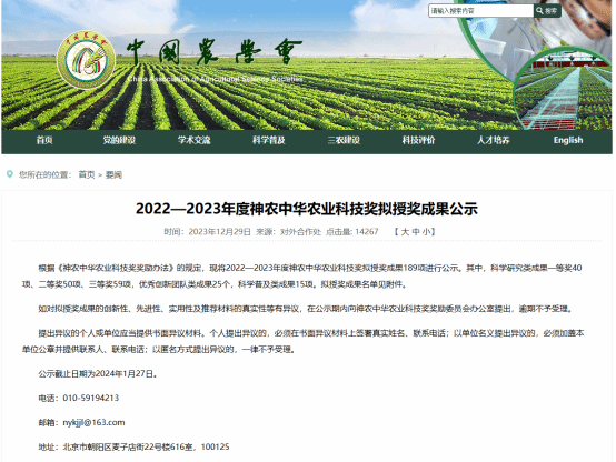 神农中华农业科技奖是2006年经农业部、科技部批准设立的面向全国农业行业的综合性科学技术奖,也是我国农业行业最高科技成果奖,每两年评选一次,主要奖励为我国农业科技进步和农业农村经济发展作出突出贡献的农业科技人员和创新团队。
